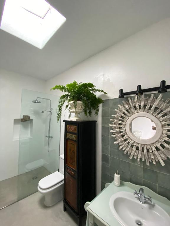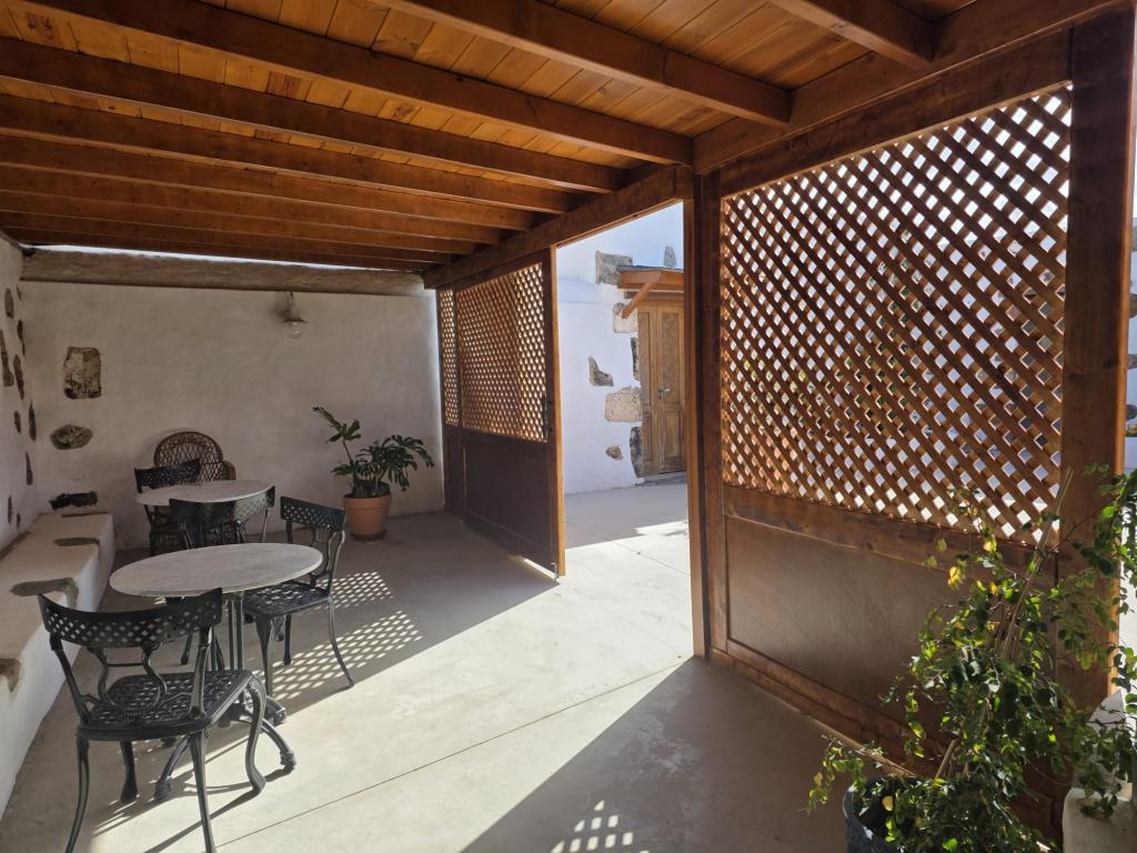 La casa gira en torno a un encantador patio central con aljibe y jardíneras, en su mayoría abierto, con una sección cubierta por una pérgola de madera con puertas correderas que incluye mesas exteriores, perfecta para disfrutar del aire libre.