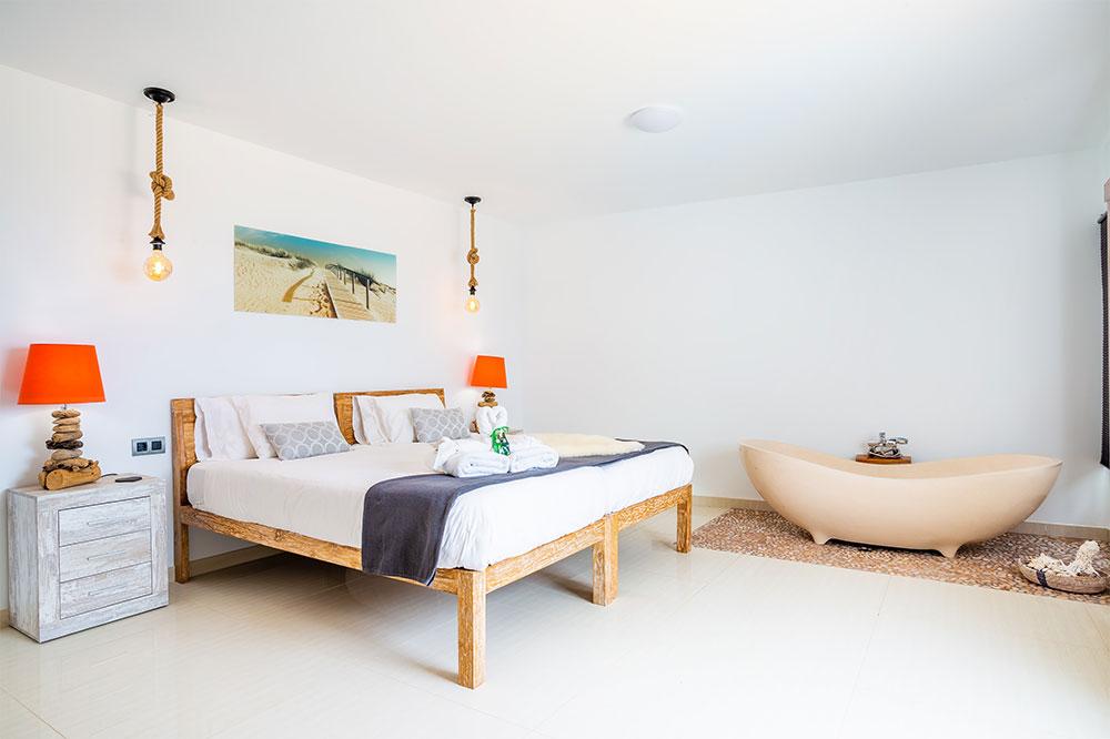 Dispone de 6 privados dormitorios distribuidos en distintos niveles: una villa principal, una suite independiente en la zona de jardín con baño en suite y terraza y tres yurts, cada uno con su baño privado. La mayoría de las habitaciones cuentan con camas king-size y baño en suite, destacando la suite principal la cual ofrece espectaculares vistas al mar, una gran cama king-size, una bañera exterior y un cuarto de ducha independiente. En conjunto, la propiedad es adaptable perfectamente tanto a estancias privadas como a la recepción de invitados.